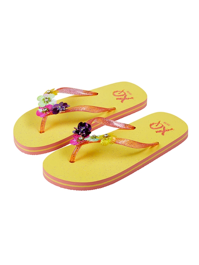 Gele slippers met bloemen op de bovenkant. De kleine maatjes hebben grotere bloemen en een achterkantje zodat het een sandaaltje wordt en beter blijft zitten.