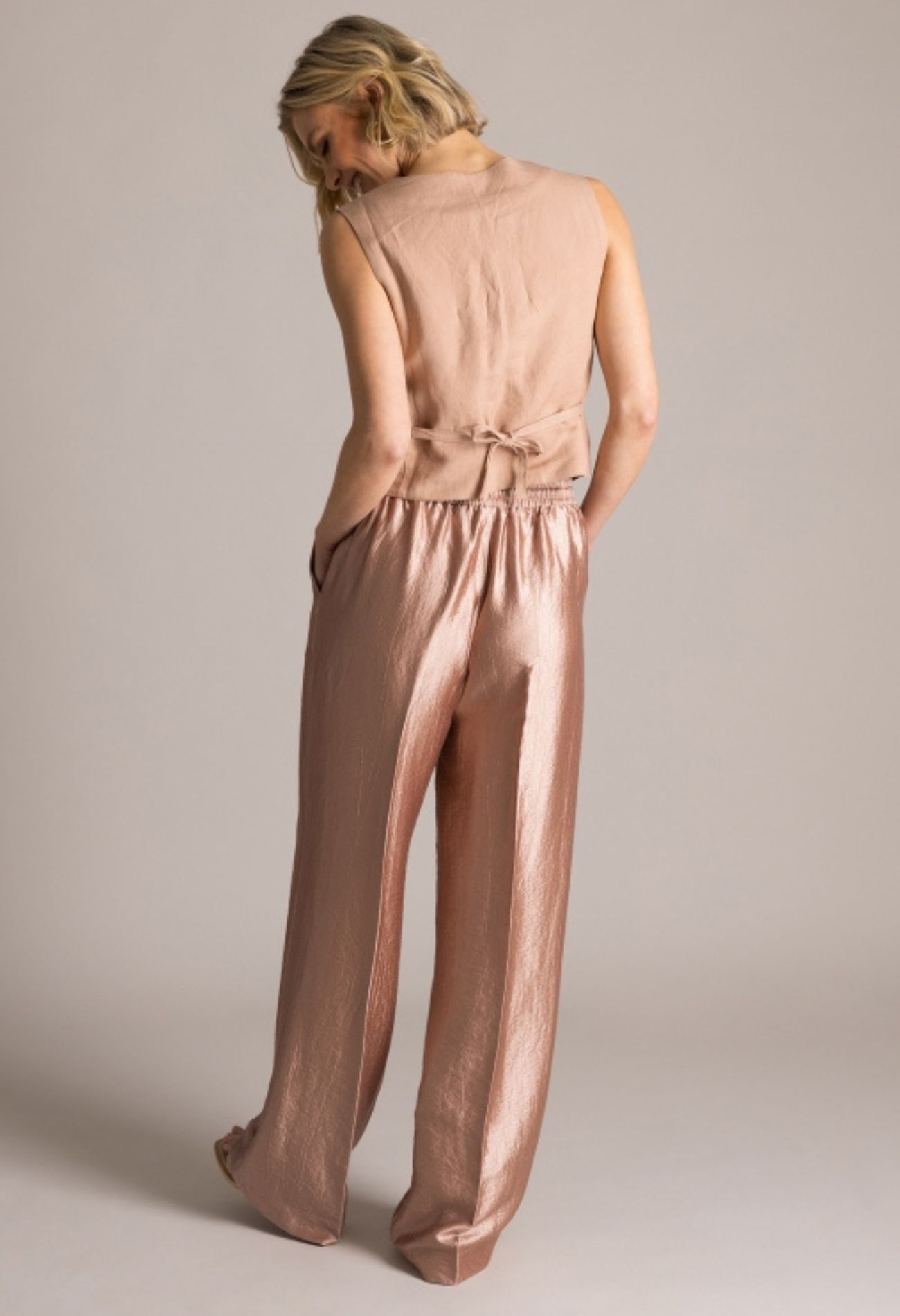 Ontdek pure elegantie met deze luxe satijnen pantalon. De subtiele glans van de stof geeft een verfijnde en chique uitstraling, perfect voor bijzondere gelegenheden zoals een trouwerij of feest. De soepelvallende pasvorm zorgt voor comfort én een flatterend silhouet, terwijl de lichte glans het geheel een exclusieve touch geeft. Een echte eyecatcher voor wie nét dat beetje extra wil uitstralen.