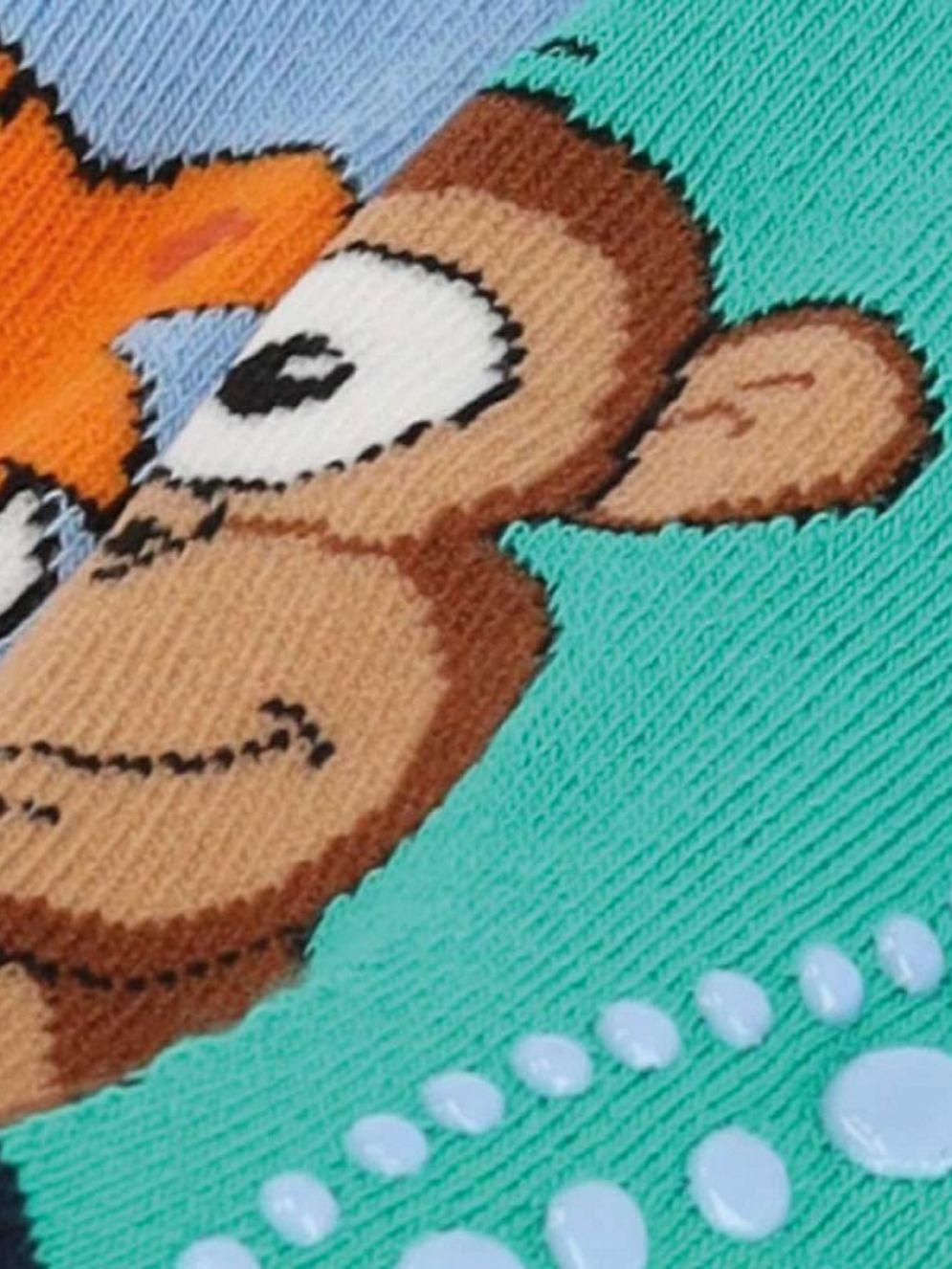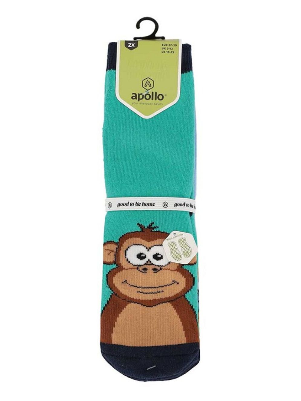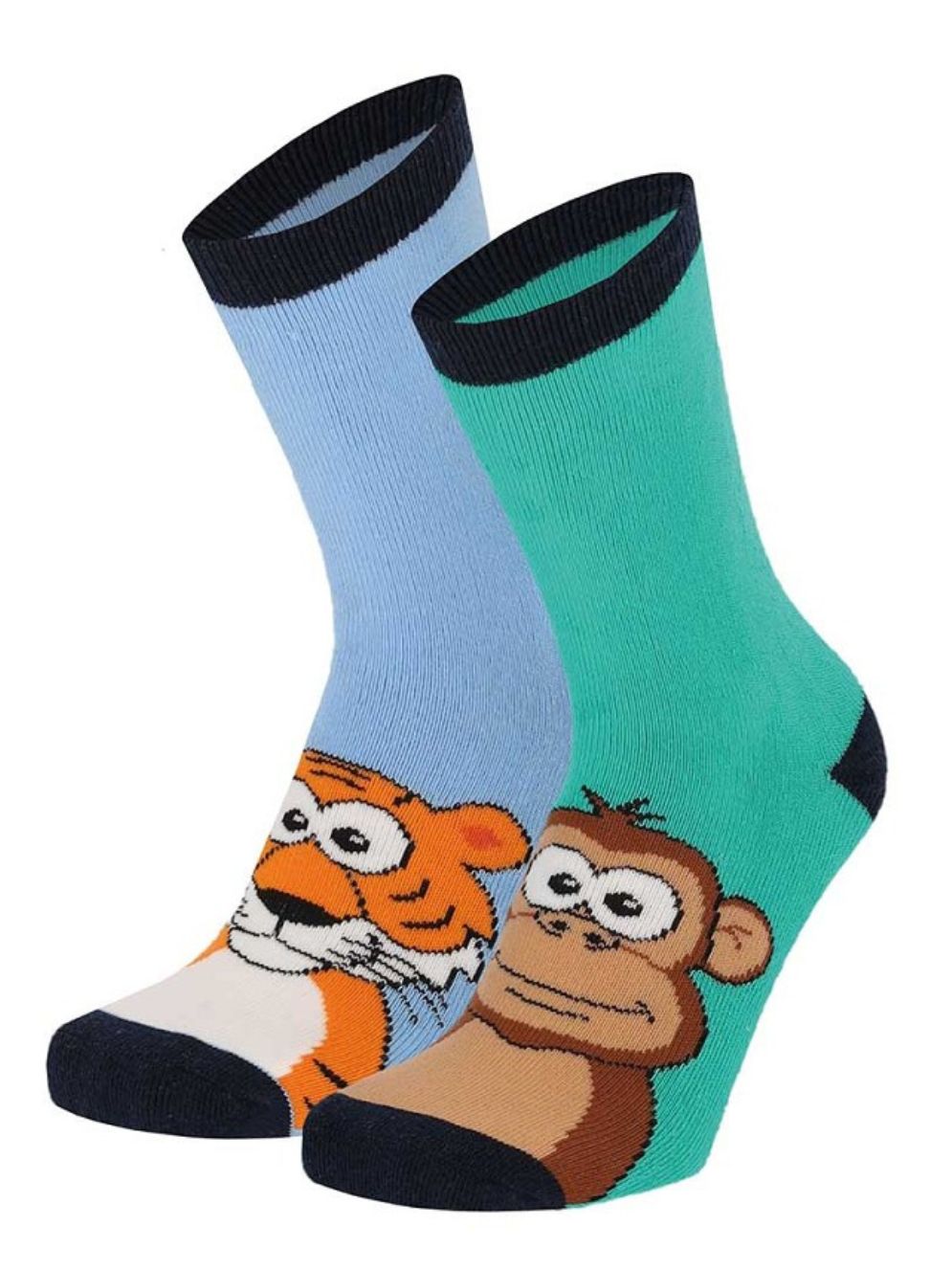Die zijn leuk! Wij noemen het onze gelukkige Happy Socks van Apollo! Ga jij voor blauw met tijgers en aapjes of voor bruin met zebra en giraffe? Deze sokken hebben hebben anti slip onder het voetbed in contrasterende kleur. Leuk! De sokken zijn per 2 paar.
