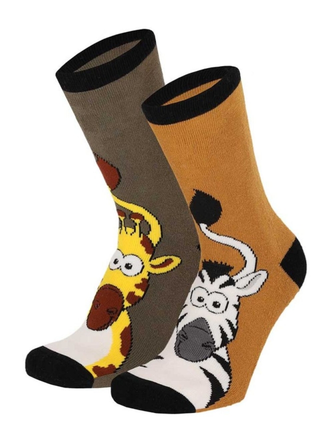 Die zijn leuk! Wij noemen het onze gelukkige Happy Socks van Apollo! Ga jij voor blauw met tijgers en aapjes of voor bruin met zebra en giraffe? Deze sokken hebben hebben anti slip onder het voetbed in contrasterende kleur. Leuk! De sokken zijn per 2 paar.