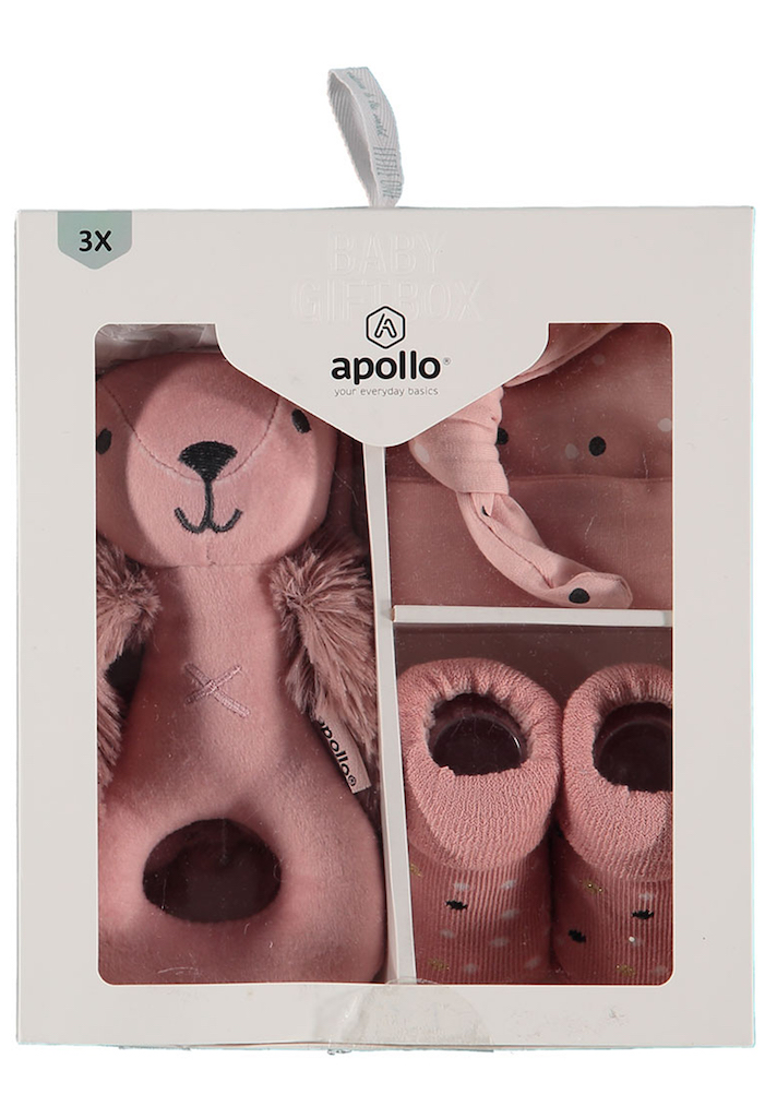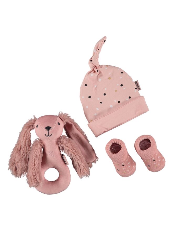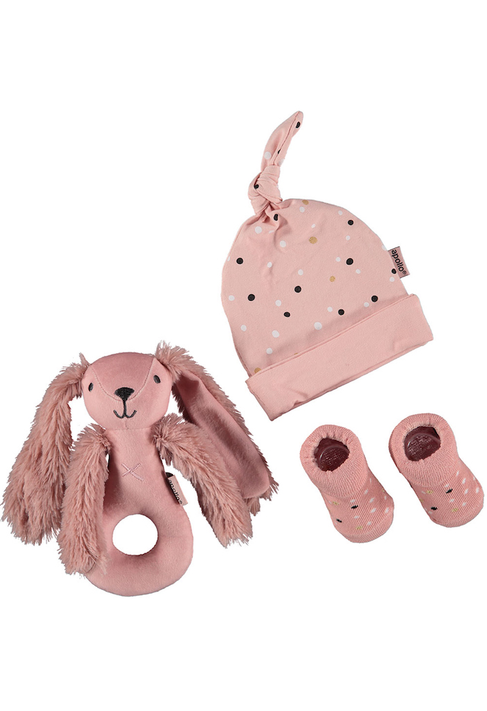 Konijnen gift box voor baby's. De set bestaat uit een rammelaar/knuffel, mutsje en slofjes.