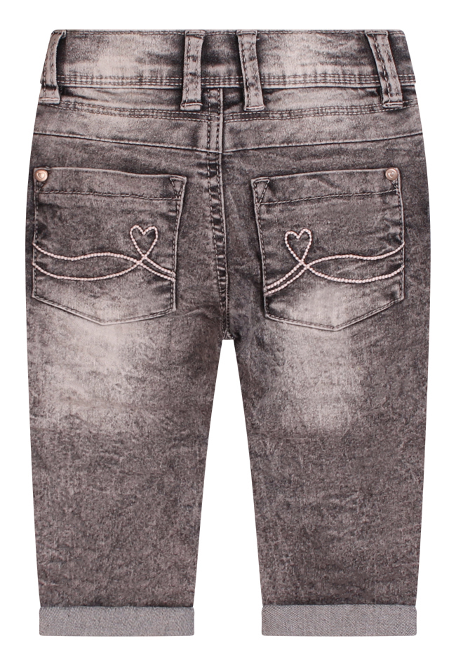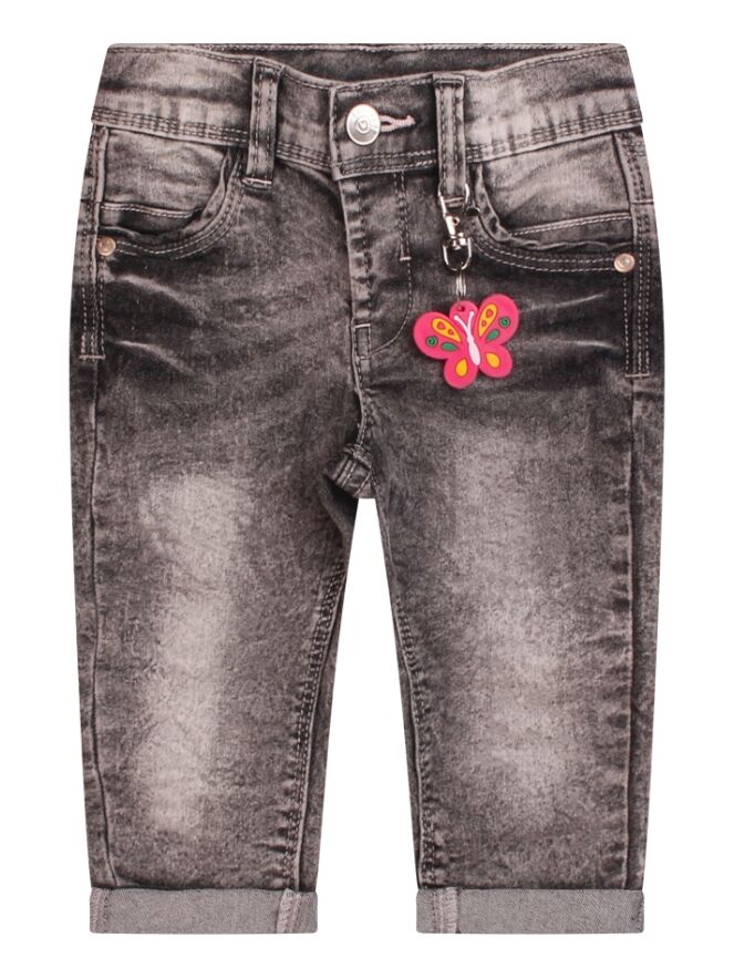 Mooie stretch denim jeans voor baby girls. Deze 5 pocket sluit met een haak sluiting en heeft sierlijke stiksels op de achterzakken. De lengte nog wat lang? Sla de broekspijp dan even om. Zo heb je een broekje op de groei want ook de taille is gewoon te verstellen. Met leuke vlinder sleutelhanger!
