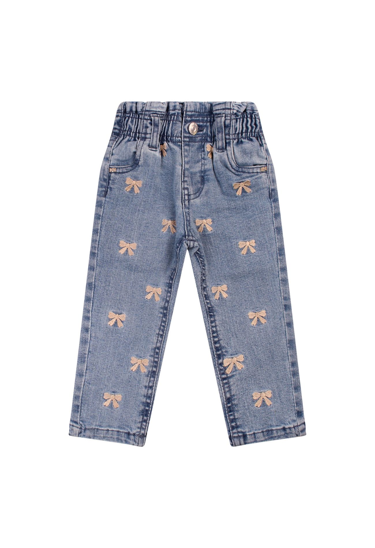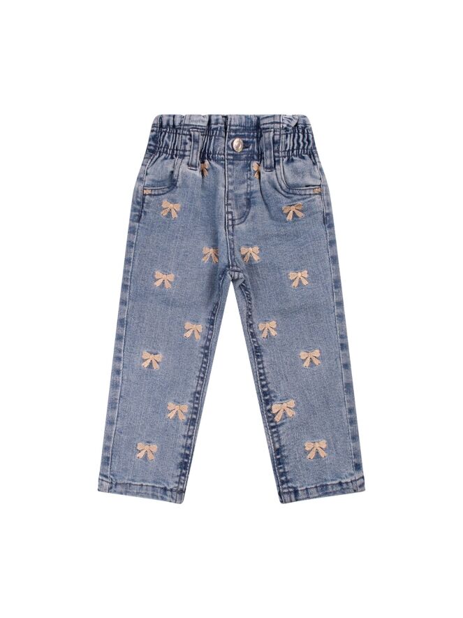 Trendy jeans met geborduurde strikjes voor een speelse touch. Het model heeft een paperbag-taille, waardoor hij mooi aansluit en tegelijk comfortabel zit. Perfect te combineren met een simpel topje of blouse.