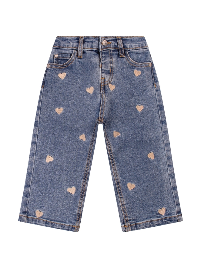 Laat je kleine meisje stralen in deze schattige baby meisjes jeans van het merk Bakkaboe. De jeans heeft een trendy rechte pijp (wide leg) en is afgewerkt met lieve geborduurde hartjes, wat zorgt voor een speelse en stijlvolle uitstraling. Dankzij de verstelbare taille groeit de broek mee met je kindje en blijft hij altijd comfortabel zitten.