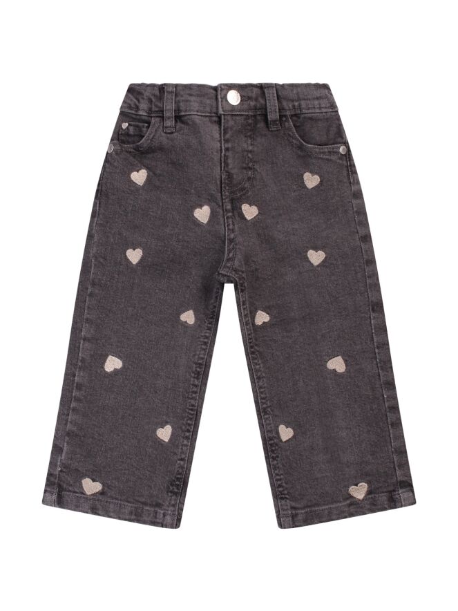 Laat je kleine meisje stralen in deze schattige baby meisjes jeans van het merk Bakkaboe. De jeans heeft een trendy rechte pijp (wide leg) en is afgewerkt met lieve geborduurde hartjes, wat zorgt voor een speelse en stijlvolle uitstraling. Dankzij de verstelbare taille groeit de broek mee met je kindje en blijft hij altijd comfortabel zitten.