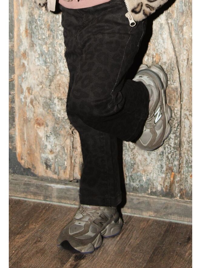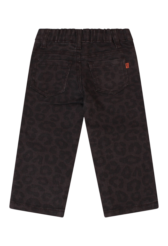 Leuke zwarte spijkerbroek met een wijde pijp en subtiele bijna niet opvallende panterprint. Deze broek heeft 5 zakken, sluit met een drukknoop en is ook nog verstelbaar in de taille. Toppertje dus!