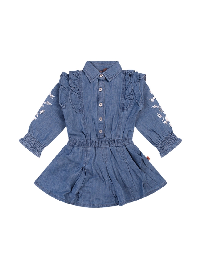 Dit denim jurkje is een perfecte mix van stoer en lief. Het heeft een comfortabele smockband in de taille voor een mooie pasvorm. De sierlijke ruches lopen speels van de voorkant over de schouders naar de achterkant, wat zorgt voor een charmante uitstraling. De mouwen zijn afgewerkt met prachtige bloemenborduursels.