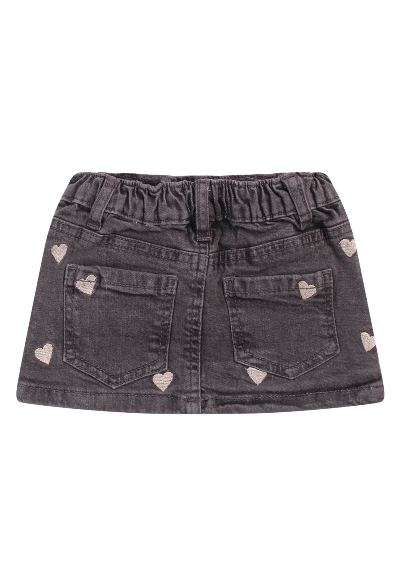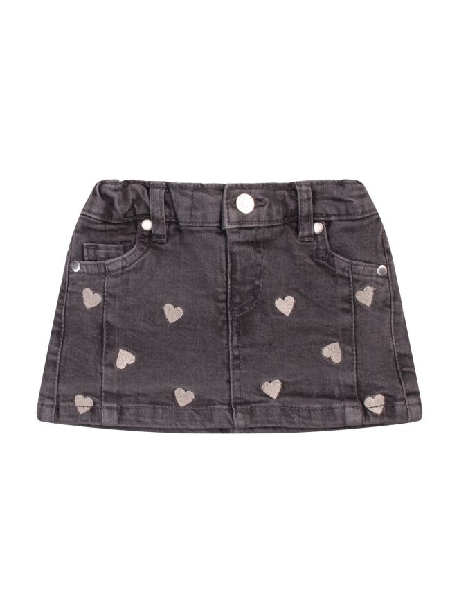 Schattig denim rokje voor baby meisjes, versierd met geborduurde hartjes. Leuk te combineren met een maillot en een sweater voor een complete winterse look.