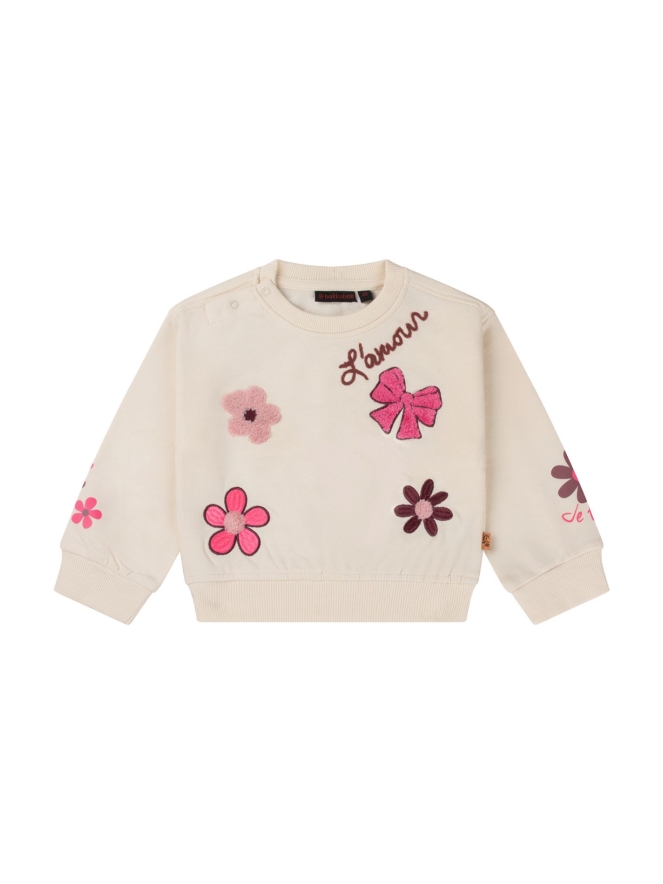 L'amour, Je taime.... Deze sweater staat vol met geborduurde, opgedrukte en appliek opdrukjes. Zoete sweater voor zoete meisjes.