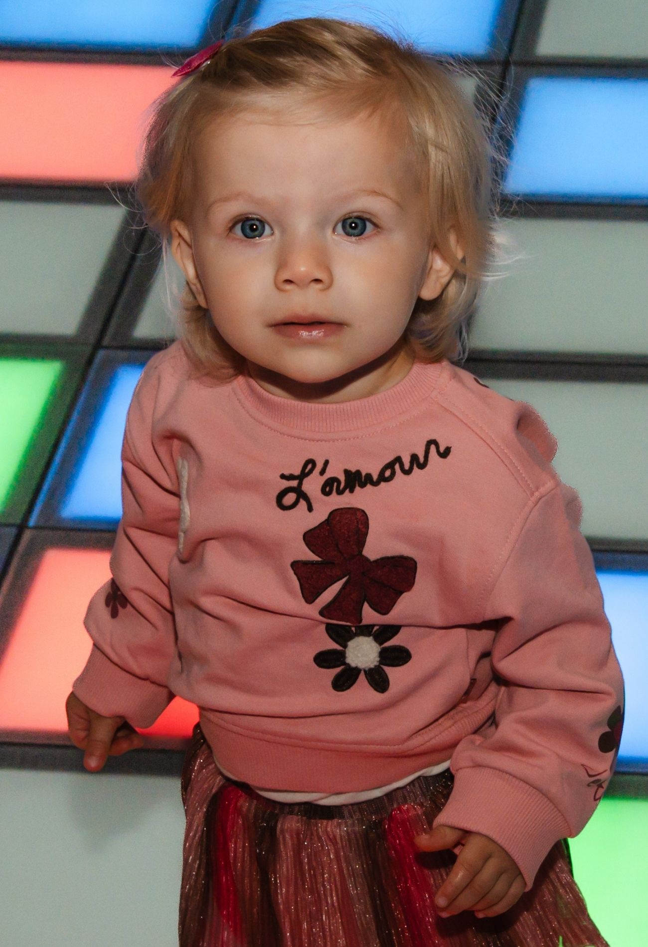 L'amour, Je taime.... Deze sweater staat vol met geborduurde, opgedrukte en appliek opdrukjes. Zoete sweater voor zoete meisjes.