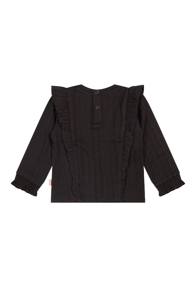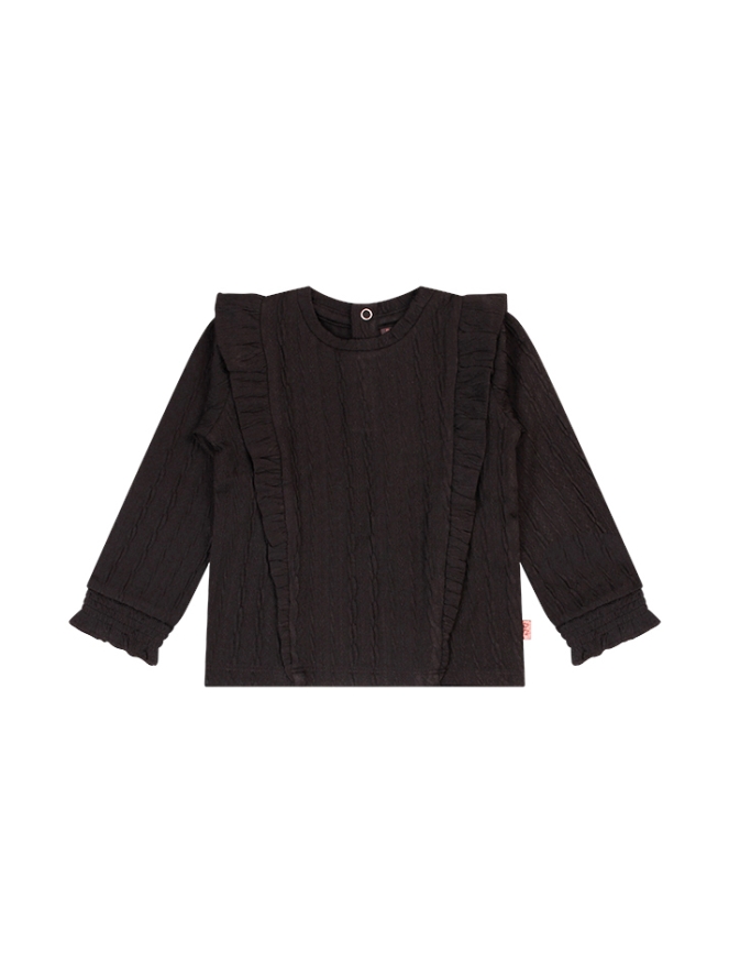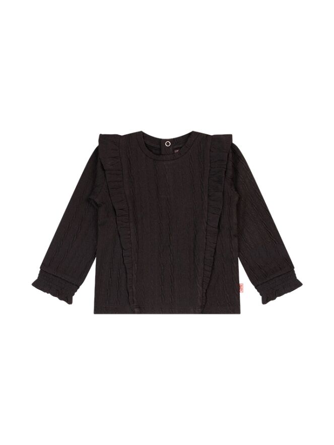 Dit schattige babyshirt is gemaakt van een zachte jacquard stof met een verfijnd werkje, perfect voor een stijlvolle look met een romantisch tintje. De ruches en smockmouwtjes geven het shirt een lieve, klassieke uitstraling. Dankzij de comfortabele pasvorm en zachte materialen is het net zo fijn om te dragen als om naar te kijken. Combineer met een legging of flared broekje voor een complete outfit.