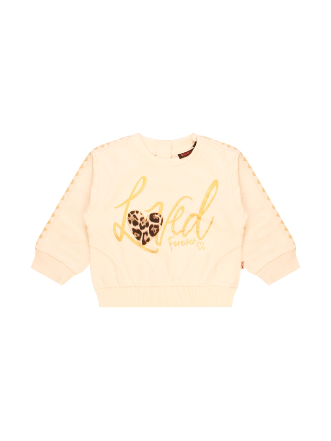 Loved forever! Deze leuke sweater met een sporty twist heeft een mooie glimmende tekstprint voorop en een bies over de mouwen met hartjesborduur. Deze fijne trui combineer je makkelijk met het bijpassende broekje welke dezelfde bies met hartjes heeft. Art.nr. W10182. Maar is ook erg leuk op een spijkerbroekje!