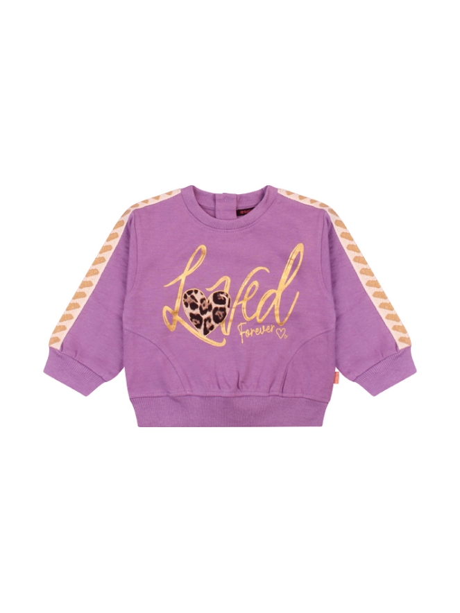 Loved forever! Deze leuke sweater met een sporty twist heeft een mooie glimmende tekstprint voorop en een bies over de mouwen met hartjesborduur. Deze fijne trui combineer je makkelijk met het bijpassende broekje welke dezelfde bies met hartjes heeft. Art.nr. W10182. Maar is ook erg leuk op een spijkerbroekje!