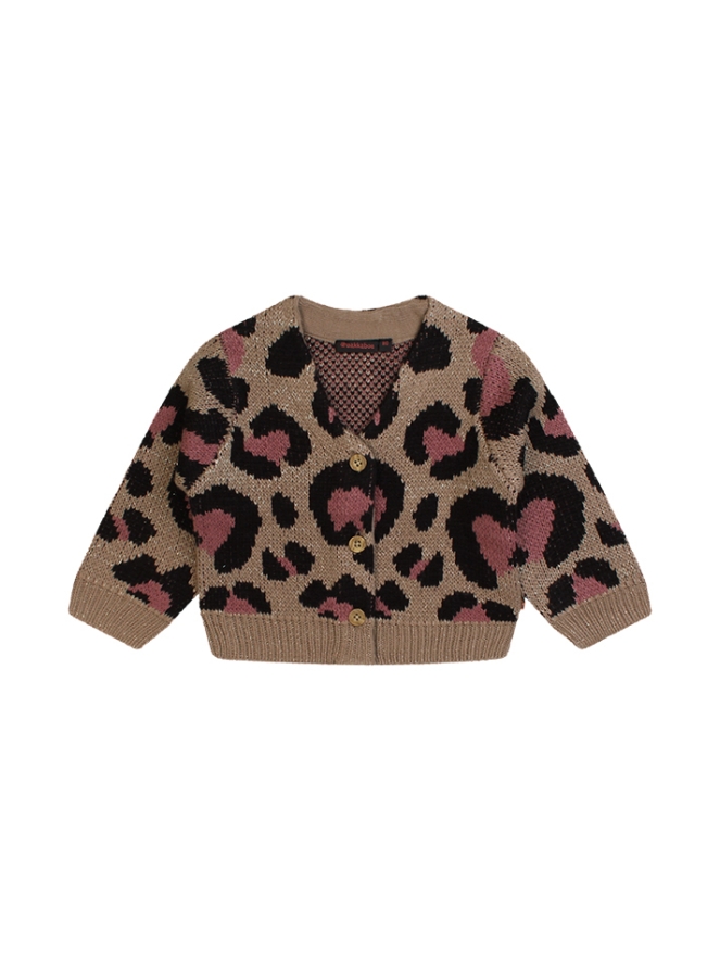Dit stijlvolle vestje voor baby meisjes combineert comfort met een speelse, trendy uitstraling. Het panterdessin zorgt voor een stoere look, terwijl de subtiele lurex glansdraad een vleugje sprankeling toevoegt. De V-hals en knoopsluiting geven het vestje een klassieke touch. Perfect om over een jurkje of shirtje te dragen op koelere dagen.