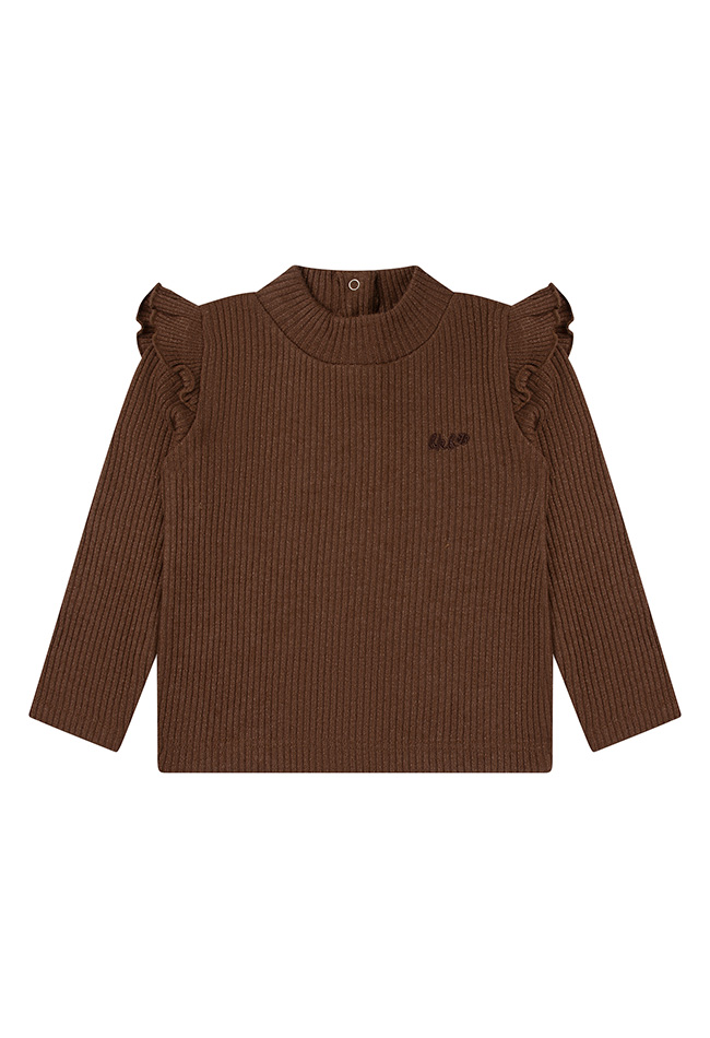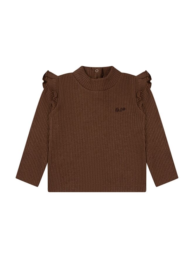 Deze lieve top voor baby meisjes is gemaakt van een zachte ribbrei met een subtiel lurex draadje voor een vleugje glans. De turtleneck zorgt voor extra warmte, terwijl de ruches op de schouders een speelse en schattige uitstraling geven. Perfect te combineren met een rokje of broekje voor een stijlvolle outfit.