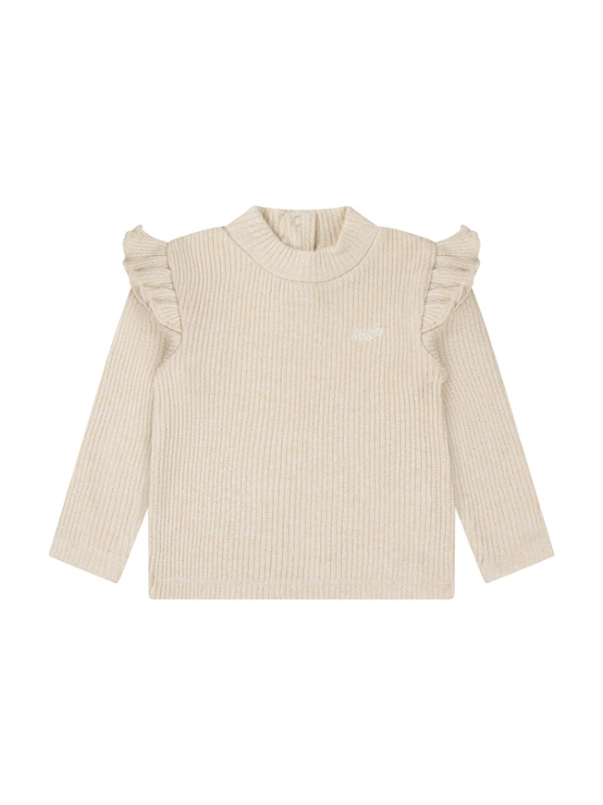 Deze lieve top voor baby meisjes is gemaakt van een zachte ribbrei met een subtiel lurex draadje voor een vleugje glans. De turtleneck zorgt voor extra warmte, terwijl de ruches op de schouders een speelse en schattige uitstraling geven. Perfect te combineren met een rokje of broekje voor een stijlvolle outfit.