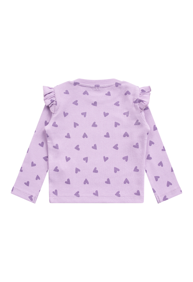 Fijn T-shirtje met een mooie ruche op de schouder en een opdruk vol met hartjes! Leuk te combineren met een spijkerbroek of effen flair broekje.