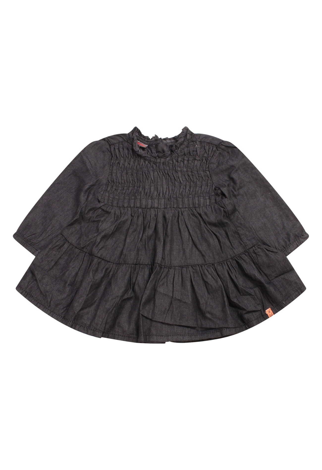 Ruimvallend jurkje van Bakkaboe van 100% katoen in denim style! Dit jurkje sluit met houtlook knoopjes op de rug.