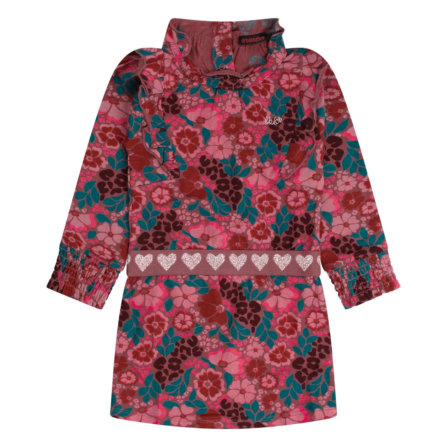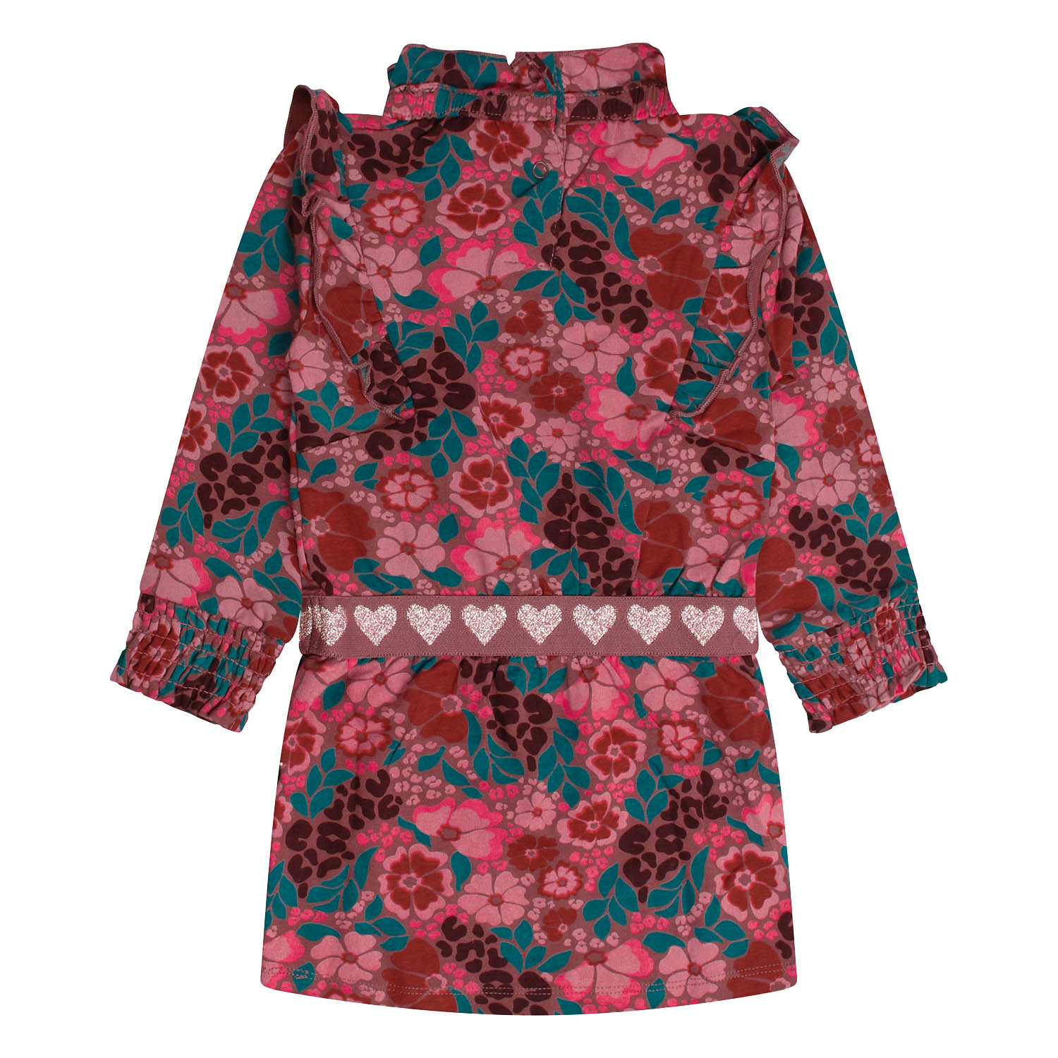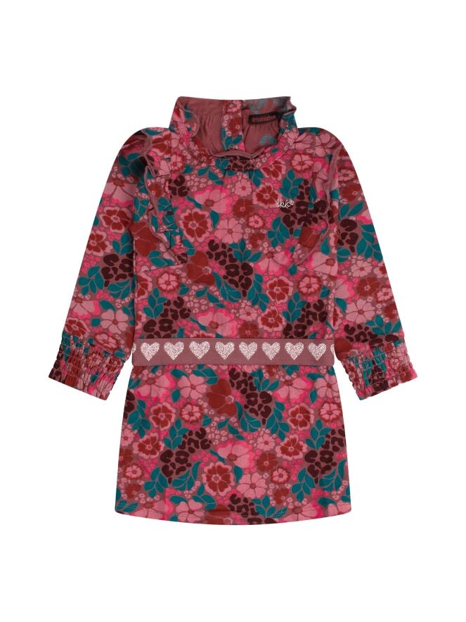 Leuk jurkje welke jouw meisje doet stralen. Vol met bloemen, hartjes in de elastische tailleband en mooie ruches op de schouder!