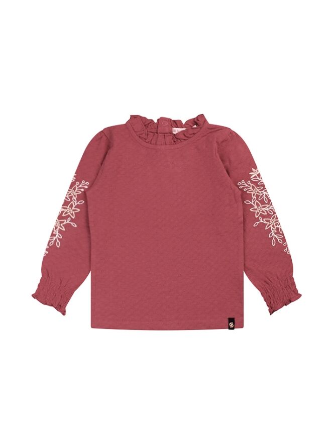 Deze schattige baby meisjes top is een echte must-have! De top is gemaakt van dobby-stof en afgewerkt met prachtig geborduurde bloemen op de mouwen. De smock turtle hals zorgt voor een lieve, speelse uitstraling. Perfect te combineren met een flared broek en een gilet voor een trendy en complete outfit.