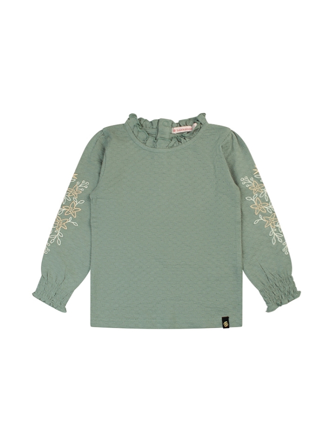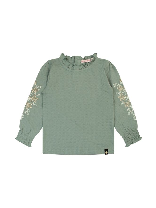 Deze schattige baby meisjes top is een echte must-have! De top is gemaakt van dobby-stof en afgewerkt met prachtig geborduurde bloemen op de mouwen. De smock turtle hals zorgt voor een lieve, speelse uitstraling. Perfect te combineren met een flared broek en een gilet voor een trendy en complete outfit.