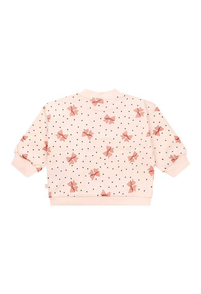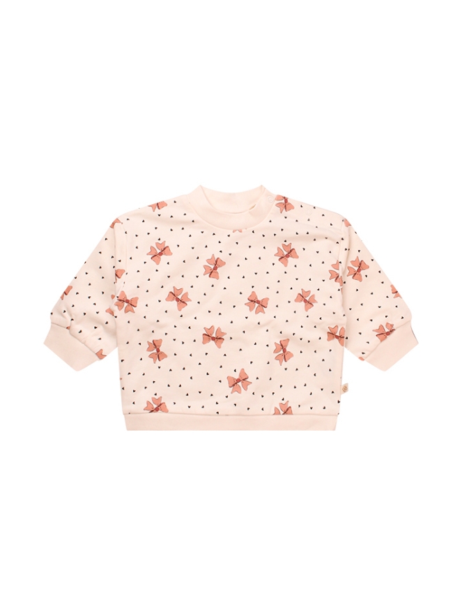 Deze speelse sweater is een echte eyecatcher dankzij het all-over dessin van strikjes en hartjes. De boxy fit geeft de sweater een moderne, iets wijder vallende pasvorm die heerlijk comfortabel zit. Gemaakt van een zachte sweatstof met biologisch katoen, is deze trui niet alleen stijlvol maar ook een verantwoorde keuze.