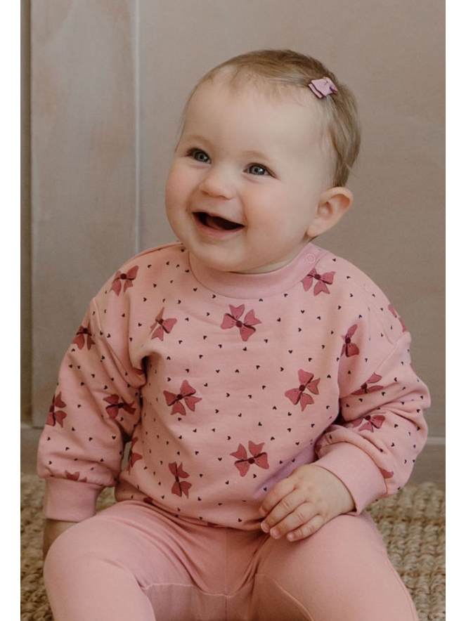 Deze speelse sweater is een echte eyecatcher dankzij het all-over dessin van strikjes en hartjes. De boxy fit geeft de sweater een moderne, iets wijder vallende pasvorm die heerlijk comfortabel zit. Gemaakt van een zachte sweatstof met biologisch katoen, is deze trui niet alleen stijlvol maar ook een verantwoorde keuze.