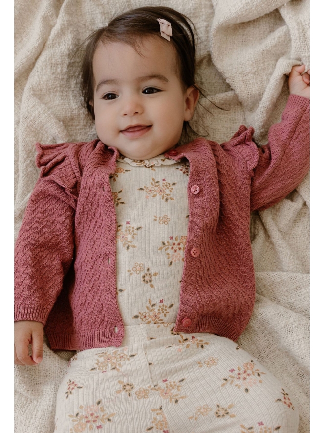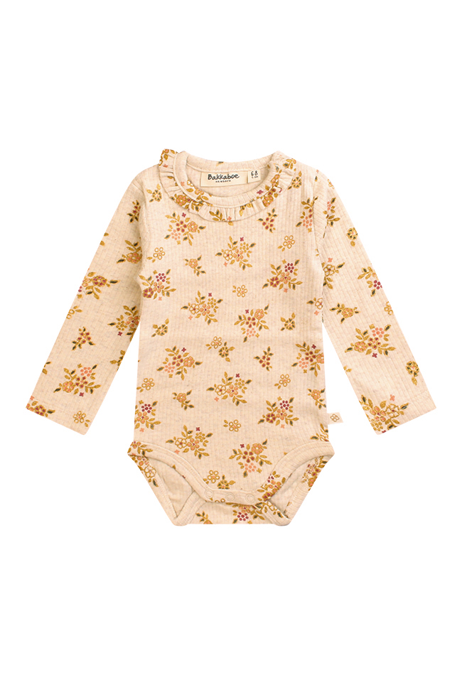 Dit schattige rompertje voor je babymeisje is een echt feestje! Het heeft een zachte ribstof met een subtiele glitter in de bloemenprint en een speelse ruches langs de halslijn. Gemaakt van biologisch katoen is het niet alleen stijlvol, maar ook zacht en comfortabel voor de gevoelige huid van je kleintje.