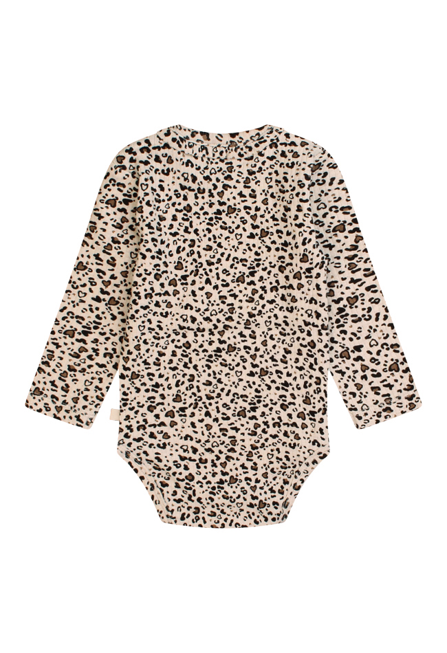 Dit trendy rompertje met panterprint heeft een leuke twist: subtiele hartjes zijn in het print verwerkt! Het rompertje is afgewerkt met een speelse ruches langs de halslijn en gemaakt van biologisch katoen voor extra comfort. Dankzij de praktische drukknopen is het makkelijk aan en uit te trekken.