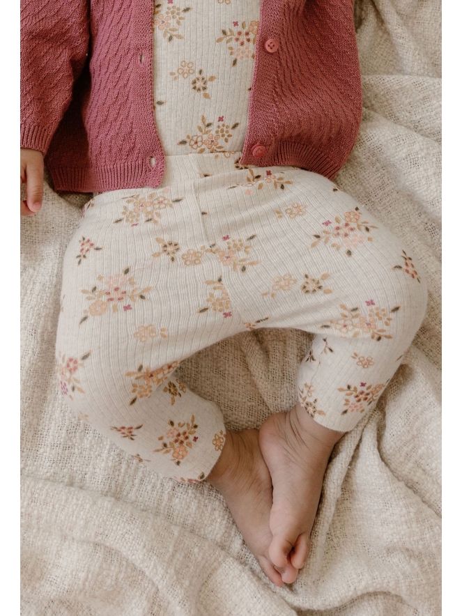 Deze legging voor babymeisjes is gemaakt van fijne ribstof en biologisch katoen, wat zorgt voor een zachte en comfortabele pasvorm. De leuke bloemenprint bevat subtiele glitters, die de legging een extra sprankeling geven. Combineer de legging met de bijpassende romper of met een ander item uit de collectie voor een complete look!