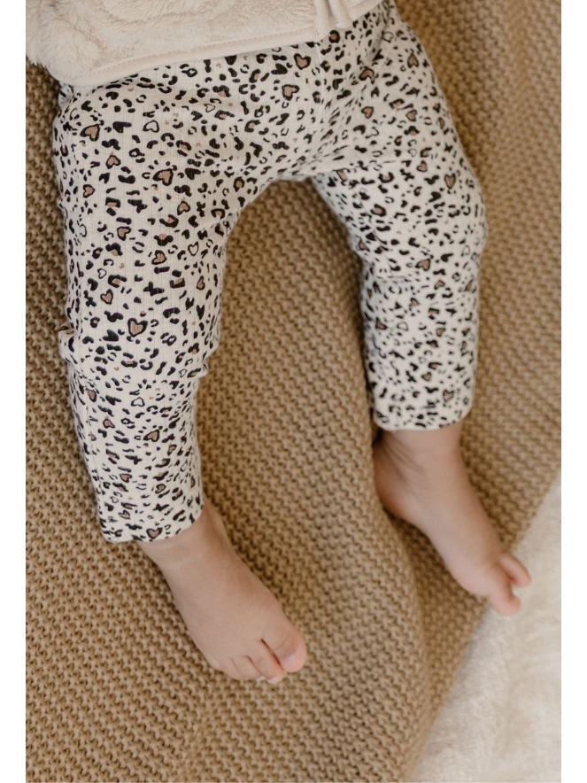 Deze panterprint legging is de perfecte match voor het bijpassende rompertje! (w10318) Met de subtiele hartjes in het panterprint heeft de legging een speelse, trendy uitstraling. Gemaakt van biologisch katoen voor ultiem comfort en met een elastische tailleband die lekker meerekt voor een goede pasvorm.
