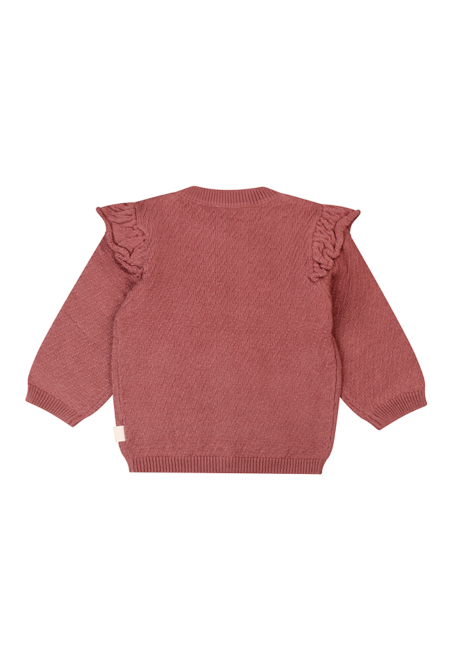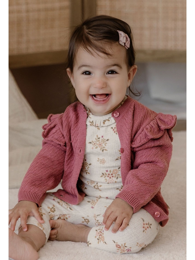Dit zachte ajourbrei vestje voor newborn babymeisjes is perfect voor een elegante en comfortabele look. Het vestje heeft schattige ruches over de schouder, die een speelse en lieve uitstraling geven. Ideaal voor de eerste outfits van je kleintje!