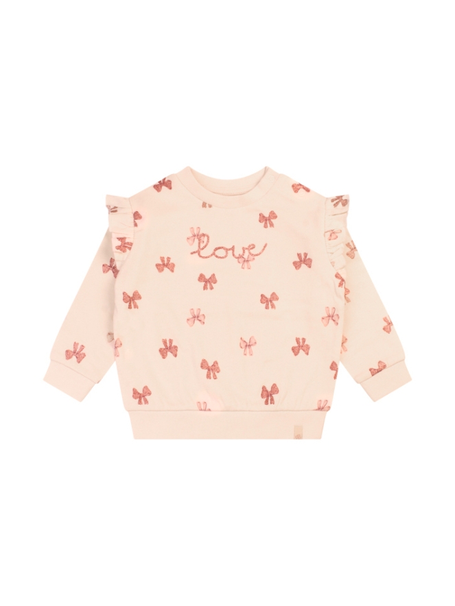 Leuke sweater voor baby meisjes van Bakkaboe. Vol met strikjes, glittertjes en ruches op de schouder. Lekker warm en comfortabel voor als het wat kouder is.