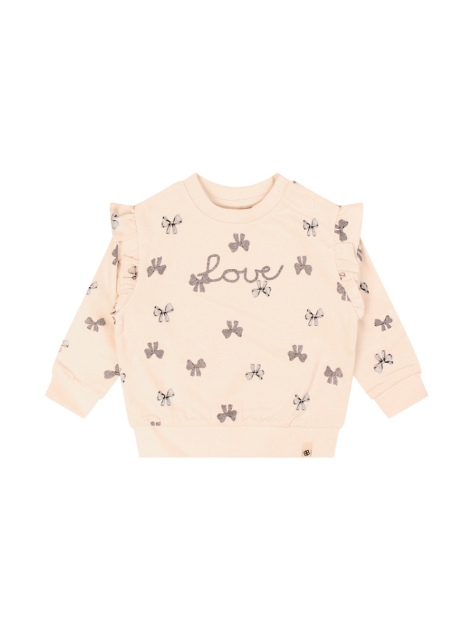 Leuke sweater voor baby meisjes van Bakkaboe. Vol met strikjes, glittertjes en ruches op de schouder. Lekker warm en comfortabel voor als het wat kouder is.
