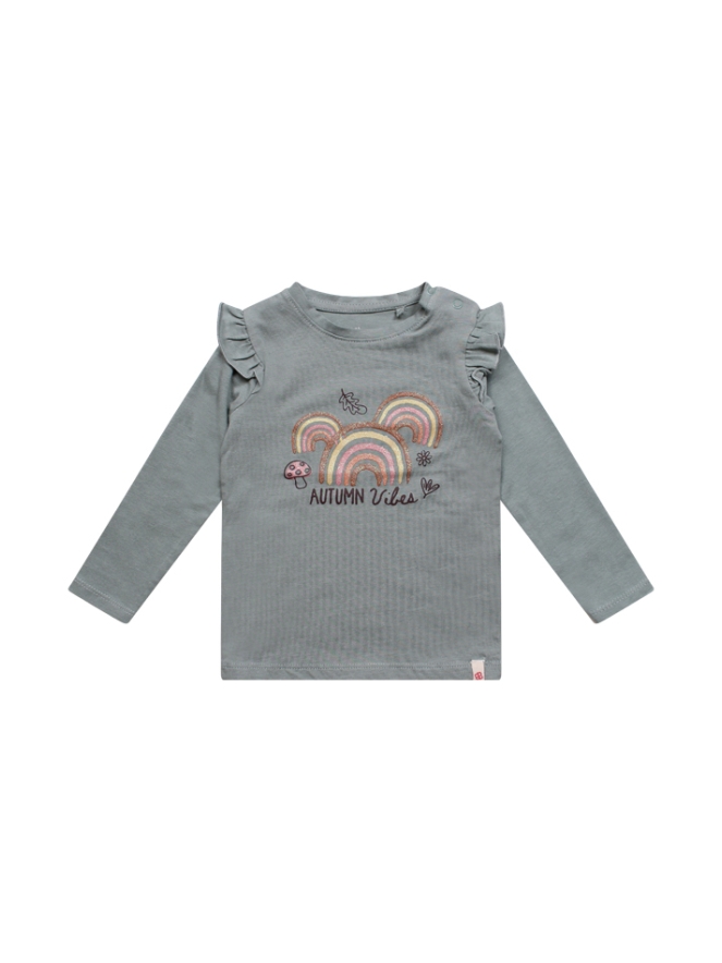 T-shirt met lange mouw van Bakkaboe. Het t-shirt heeft een glitter regenboog print met herfst details en de tekst Autumn Vibes. En er zit ruche op de schouders. Materiaal: 95% katoen, 5% elasthan. Wassen op 30 graden, niet bleken, niet in de droger, kan gestreken worden.