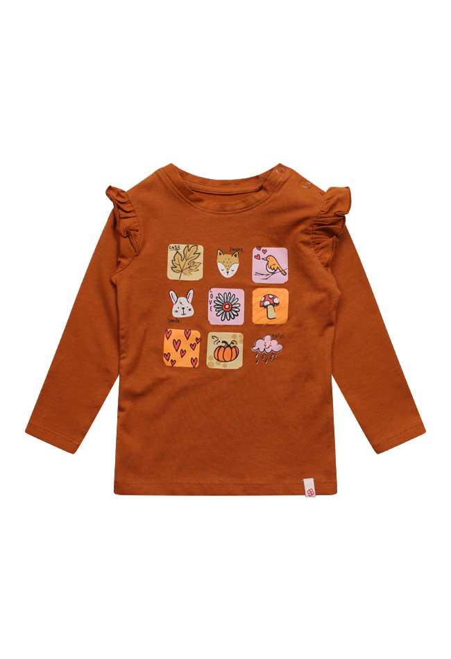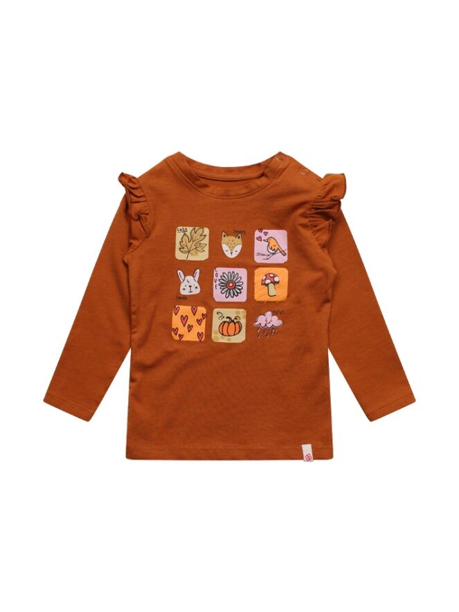 T-shirt met lange mouw van Bakkaboe. Het t-shirt heeft blok print met kleine printjes met een herfst thema. Materiaal: 95% katoen, 5% elasthan. Wassen op 30 graden, niet bleken, niet in de droger, kan gestreken worden.