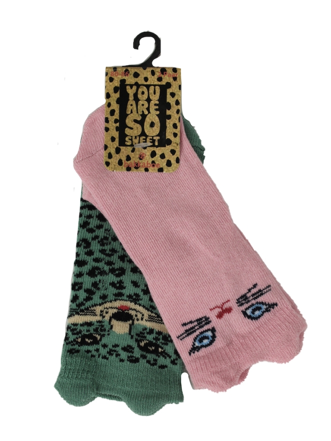 2 paar sokjes van Bakkaboe. 1 paar met panter print en 1 paar katten gezicht. De sokjes hebben oortjes. Wassen op 30 graden, niet bleken, niet in de droger, kan gestreken worden.