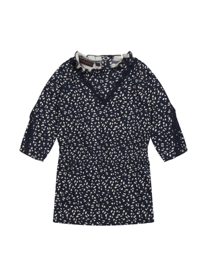 Baby meisjes jurkje in stippen patroon. Dit jurkje heeft een ronde hals met een elastische tailleband en versiersels in bijpassend sierband.