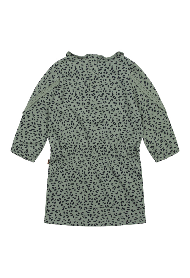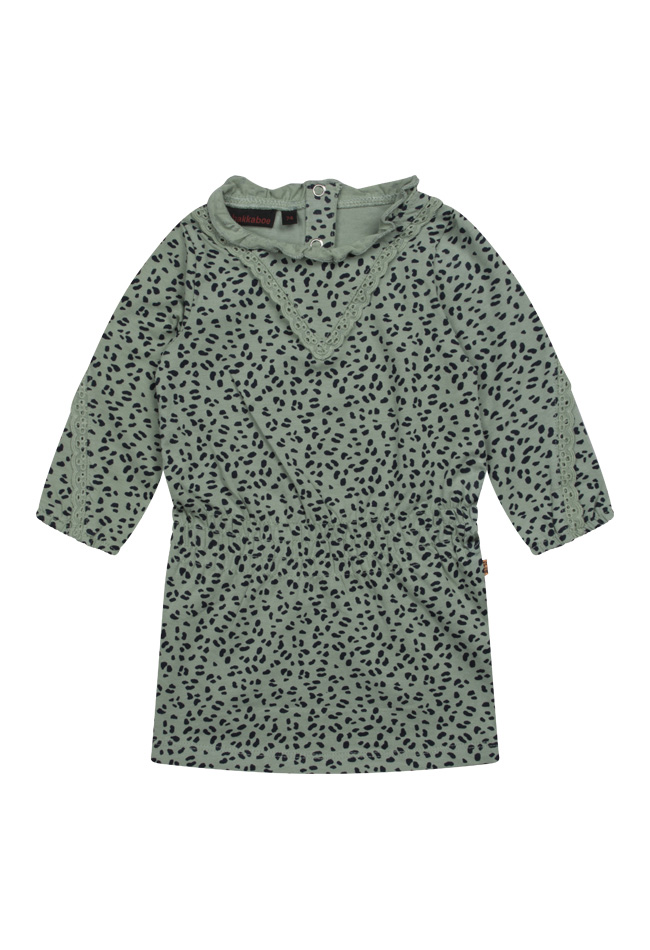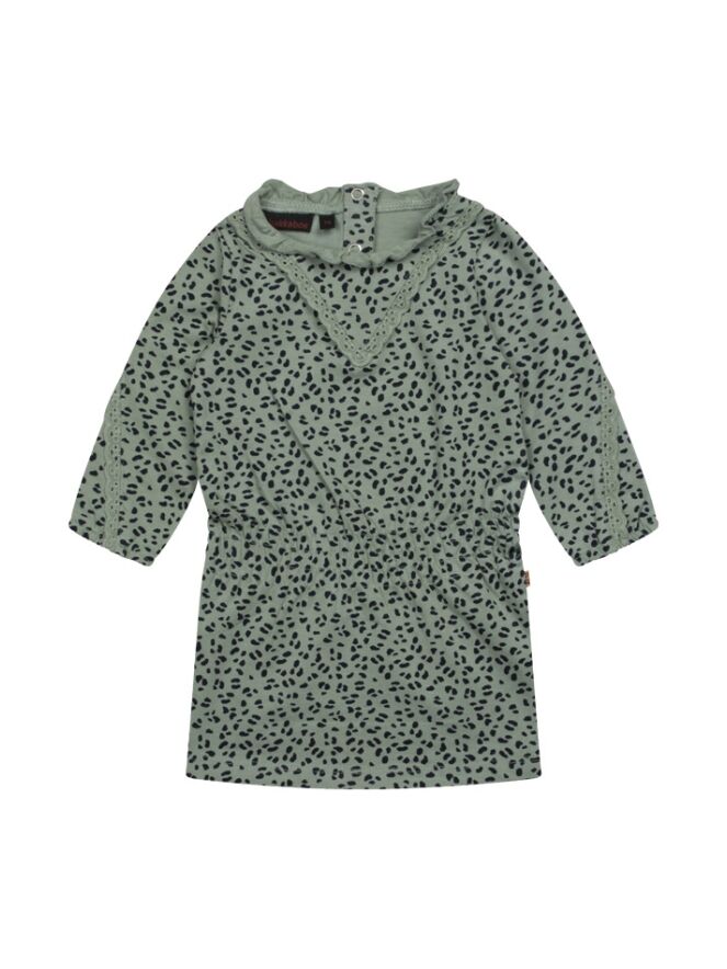 Baby meisjes jurkje in stippen patroon. Dit jurkje heeft een ronde hals met een elastische tailleband en versiersels in bijpassend sierband.