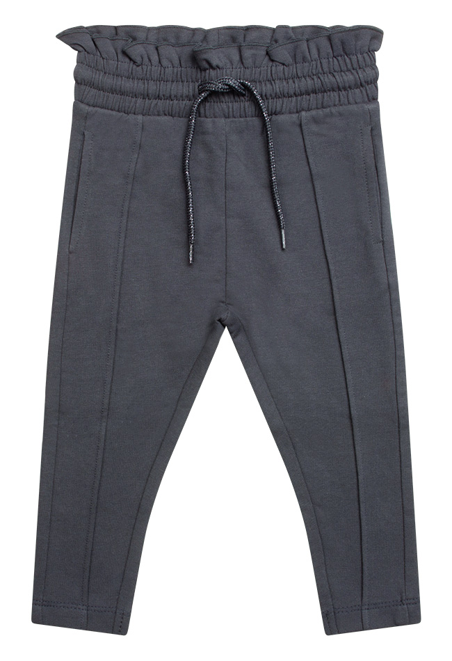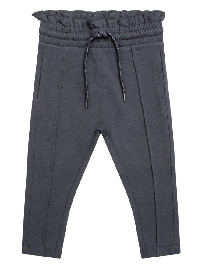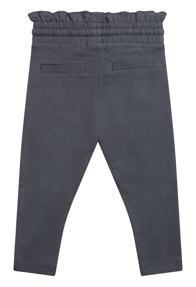 Broekje van sweatstof met elastische tailleband en koord. Op de taille zit tevens een ruche rand. Met 2 steekzakken voorop en op de kont.