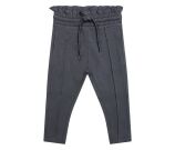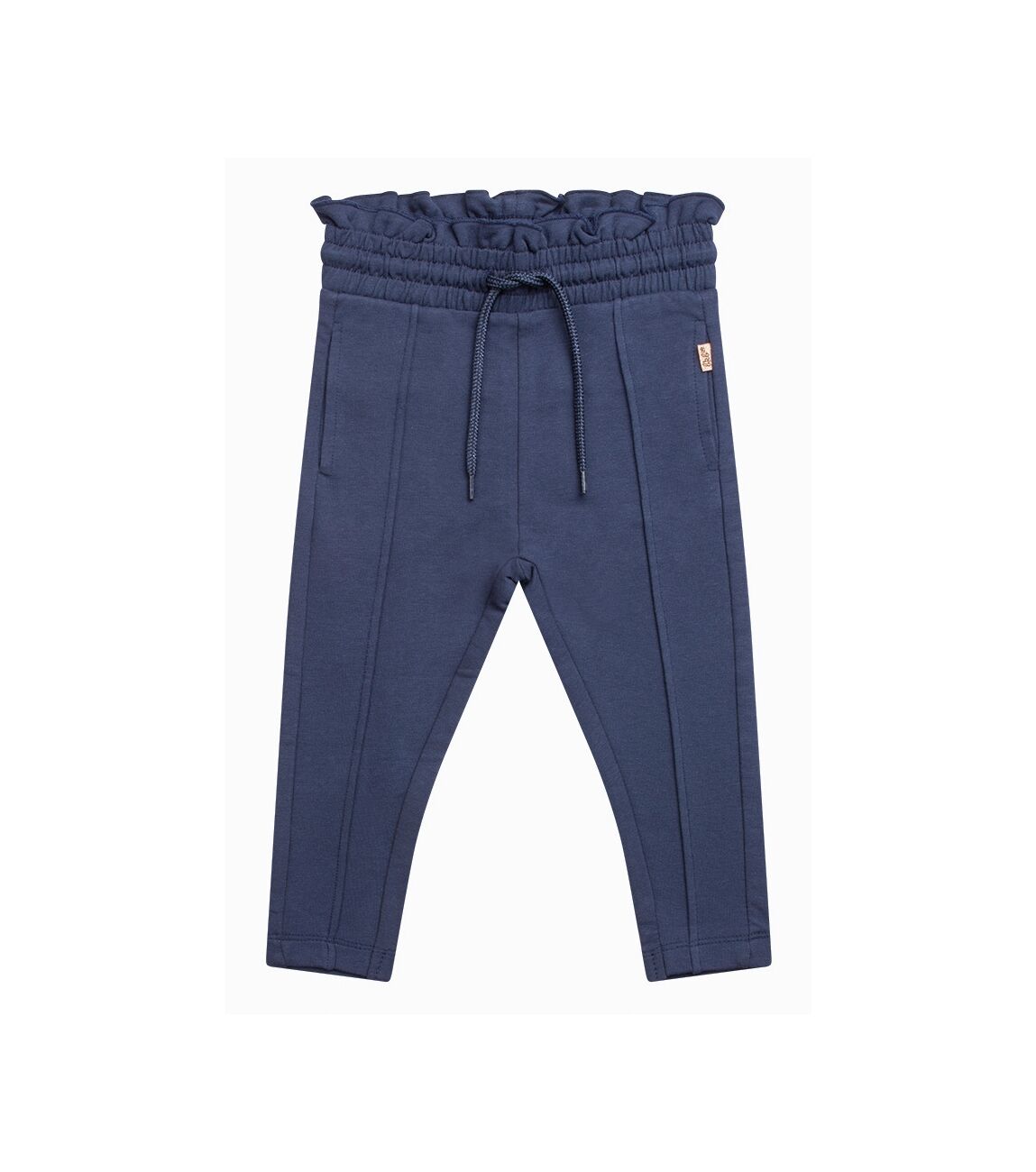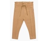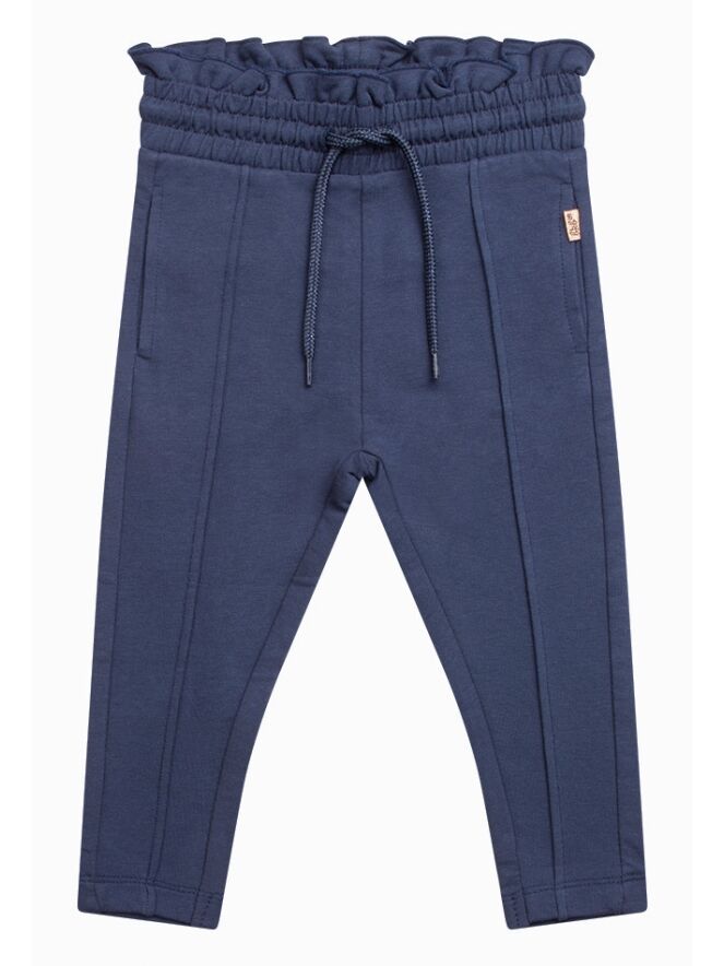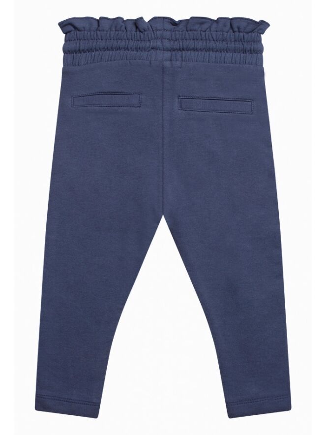 Broekje van sweatstof met elastische tailleband en koord. Op de taille zit tevens een ruche rand. Met 2 steekzakken voorop en op de kont.