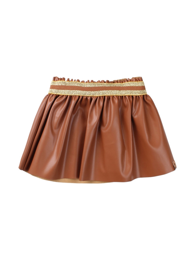 Korte imitatie leren gerimpelde rok. De tailleband is gemaakt van een glitter elastiek.
