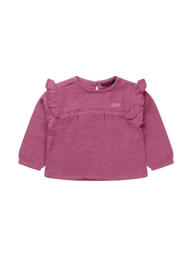 Top gemaakt van katoenen mousseline stof met een rond hals en lange mouwen met elastiek in de boord. Over de schouders lopen ruches en over de borst loopt een kanten tape detail. De achterkant sluit met een knoopje voor gemakkelijk aan- en uittrekken.