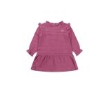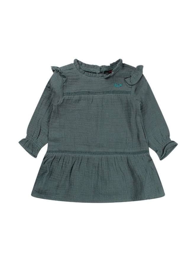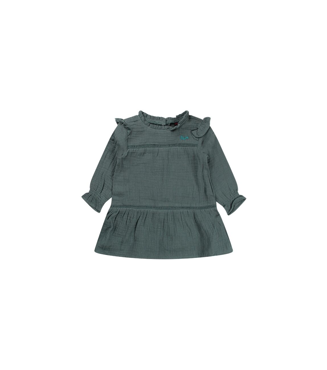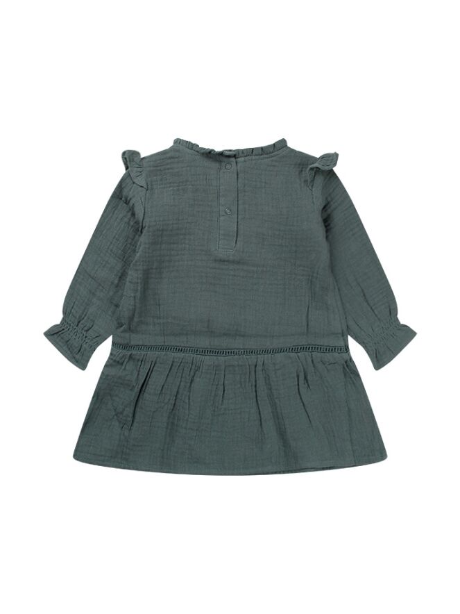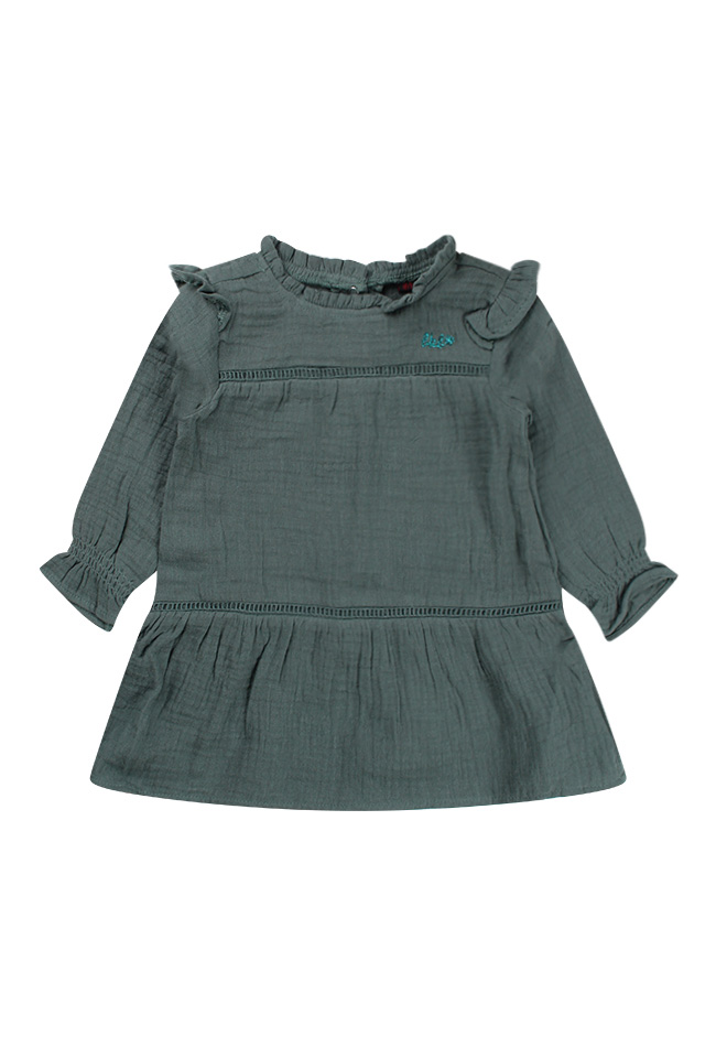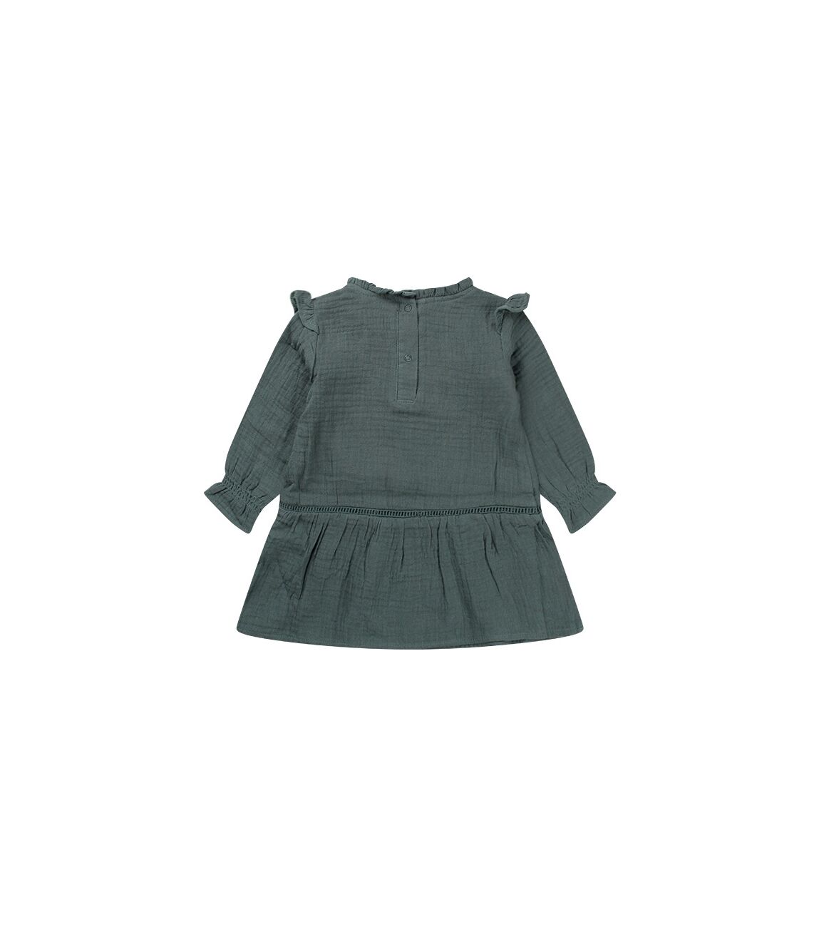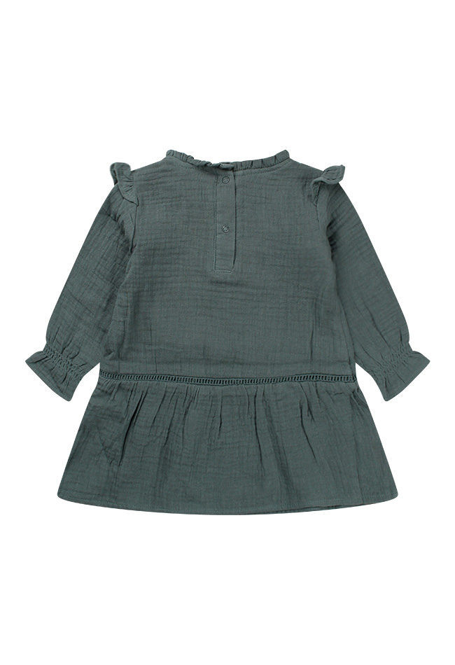 Jurk gemaakt van katoenen mousseline stof met een rond hals met ruche detail en lange mouwen met elastische smock boord. Over de schouders lopen ruches en over de borst en taille loopt een kanten tape detail. De achterkant sluit met een druk knoopjes voor gemakkelijk aan- en uittrekken.