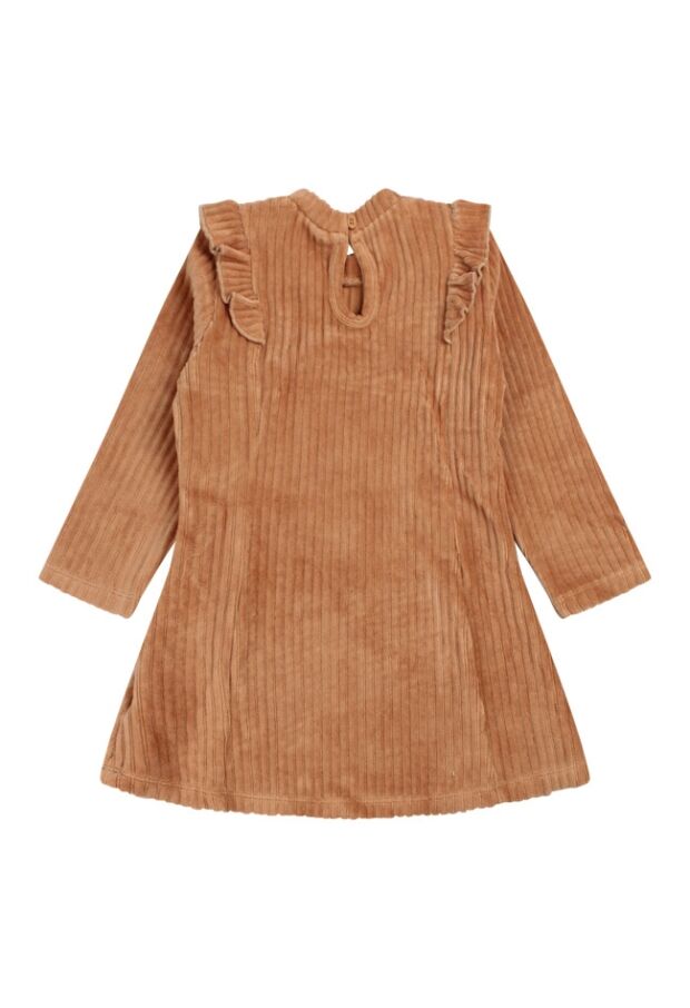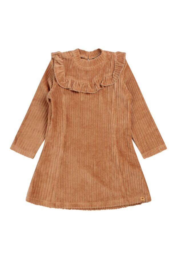 Mooi uitlopend jurkje van Bakkaboe. Dit model is gemaakt van een grove ribvelours en voelt dan ook heerlijk zacht aan. Op de rug zit een kleine druppeluitsparing. Deze sluit met een knoopje.