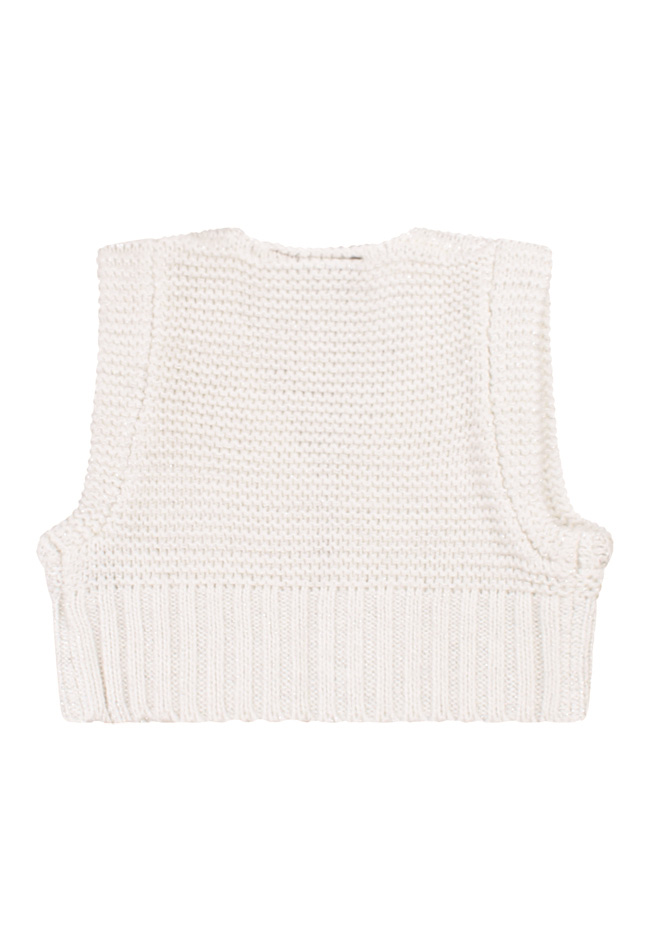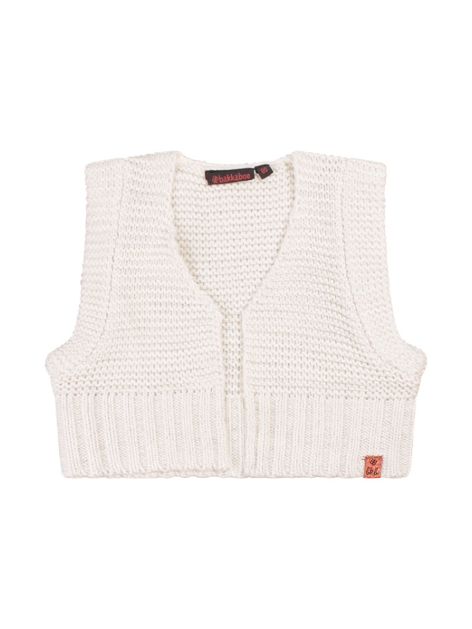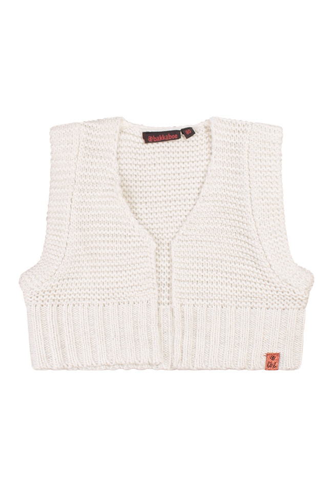 Gebreid en met een glittertje! Dat omschrijft dit leuke giletje voor baby meisjes van Bakkaboe het beste! Door het garen zit een metallic draadje verweven zodat een glittertje zichtbaar wordt. Bescheiden maar super hip en trendy! Leuk te combineren over een top!