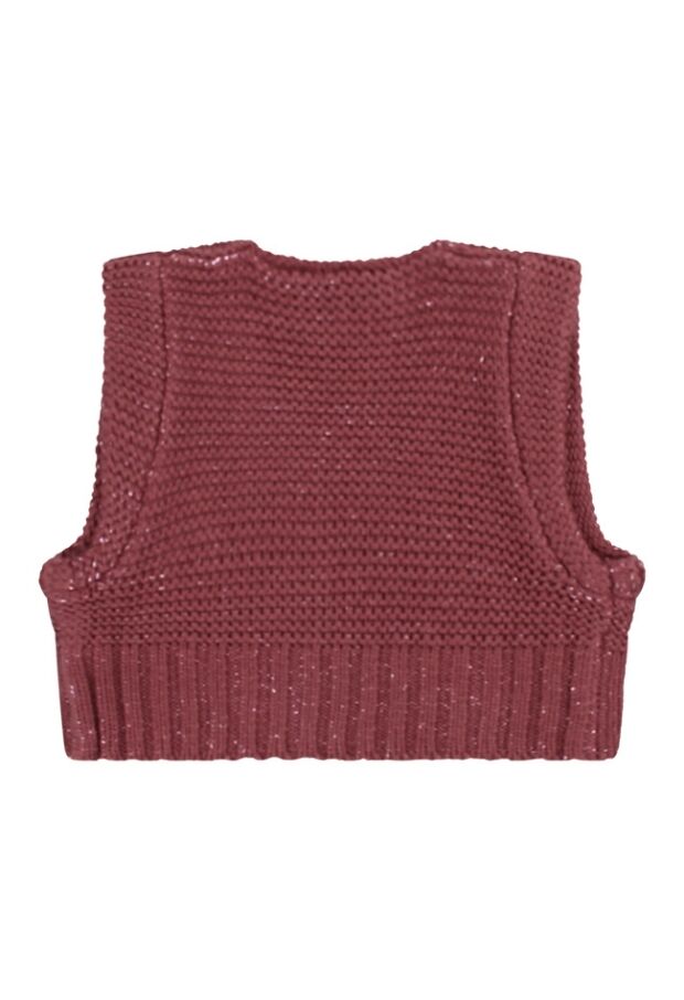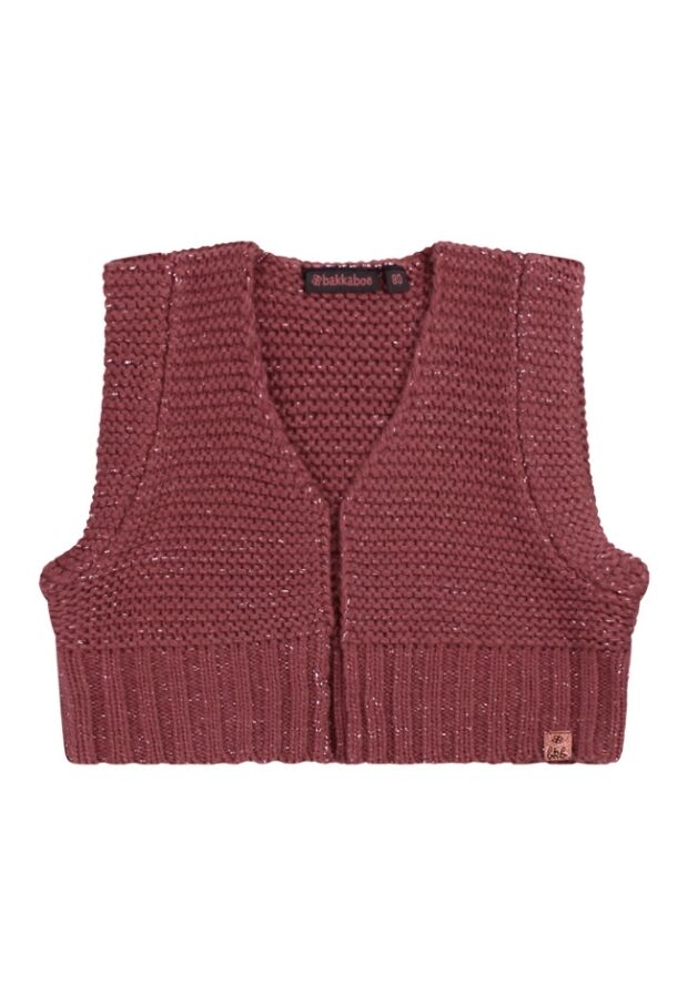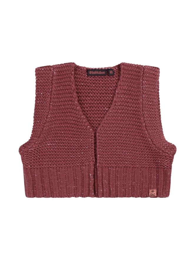 Gebreid en met een glittertje! Dat omschrijft dit leuke giletje voor baby meisjes van Bakkaboe het beste! Door het garen zit een metallic draadje verweven zodat een glittertje zichtbaar wordt. Bescheiden maar super hip en trendy! Leuk te combineren over een top!