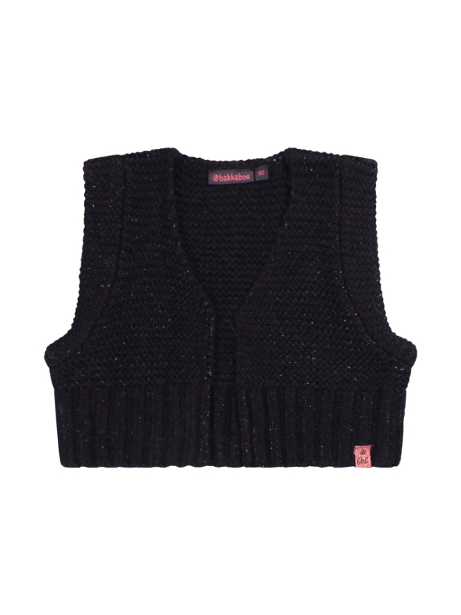 Gebreid en met een glittertje! Dat omschrijft dit leuke giletje voor baby meisjes van Bakkaboe het beste! Door het garen zit een metallic draadje verweven zodat een glittertje zichtbaar wordt. Bescheiden maar super hip en trendy! Leuk te combineren over een top!