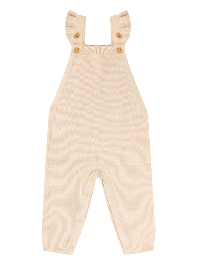 Dit tuinbroekje of shortall is van een fijn breisel met verstelbaren schouderbandjes met houtlook knoopjes. Aan de binnenkant van de benen zitten drukknoopjes voor het makkelijk aan en uittrekken.
