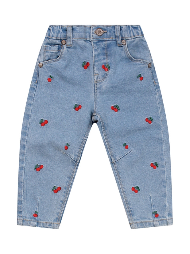 Kersen zijn helemaal hot dit seizoen! Je ziet het overal terug zo ook op deze leuke jeans die vol zit met kersen borduur. Dit broekje heeft een elastische inzet in de taille en sluit met een drukknoop. Met mooie toelopende pijp.